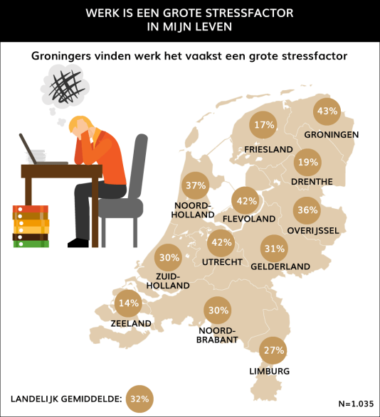 Het is algemeen bekend dat stress kan lijden tot gezondheidsklachten. Uit het onderzoek blijkt dat een derde van de ondervraagden werk als een grote stressfactor ziet. Millennials scoren met 36 procent wederom het hoogst. Kloosterhuis: “Dat werk voor stress zorgt, verbaast mij niet. Het is juist de vraag hoe je hiermee omgaat. De sleutel ligt wat mij betreft in het bewust worden van zowel negatieve als positieve emoties. Door vaker stil te staan bij wat je doet (mindful zijn), word je meer bewust van je prestaties. Hierdoor zul je meer voldoening halen uit alles wat je doet.”