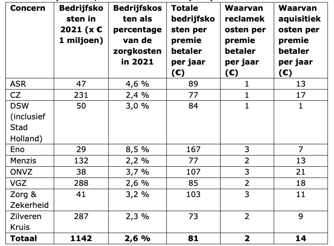De kosten die zorgverzekeraars maken (en geen directe zorgkosten zijn) noemen wij bedrijfskosten. Deze bedrijfskosten waren gemiddeld genomen 81 euro per premiebetaler per jaar in 2021 (het meest recente jaar waarvoor cijfers beschikbaar zijn). Dit is 2,6% van de totale zorgkosten. In Tabel 1 is een overzicht te zien van de cijfers voor 2021.