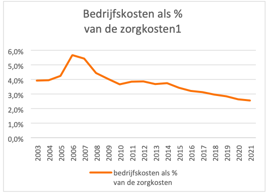 De bedrijfskosten liggen ook lager dan ten tijde van het ziekenfonds in termen van percentage van de totale zorgkosten (3,9% in 2004 en 2,6% 2021). Dit is te zien in grafiek 1.