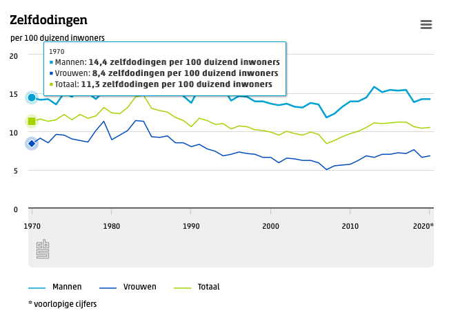 Onder tieners is sinds de jaren zeventig de sterfte door zelfdoding gestegen van 1,8 naar 3,1 zelfdodingen per 100 duizend tieners in 2020.