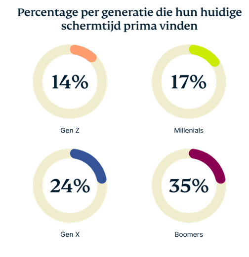 Neem bijvoorbeeld Gen Z. Ze doen een opmerkelijke poging om de schermtijd terug te dringen: 17% slaagt erin hun gebruik op alle of de meeste dagen te beperken en nog eens 29% slaagt daar grotendeels in. 28% vindt het echter te moeilijk om de schermtijd te verminderen, en 12% probeert het niet eens, ondanks dat ze vinden dat ze te veel schermtijd hebben. Nog eens 14% is tevreden met de schermtijd.