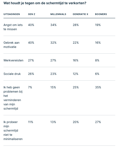 De uitdagingen bij het verminderen van schermtijd variëren sterk van generatie tot generatie. Voor Generatie X en Babyboomers zijn de angst om iets te missen en het gebrek aan motivatie minder intens. Ongeveer 25% van Generatie X en 35% van de Boomers melden dat er geen noemenswaardige problemen zijn bij het terugdringen van hun digitale consumptie. Ter vergelijking: slechts 7% van Gen Z en 15% van de Millennials denkt er hetzelfde over.