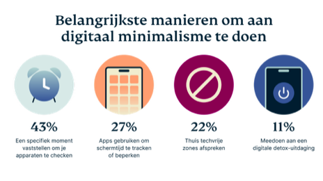Een populaire aanpak is het instellen van specifieke tijden om je apparaten te gebruiken. Voor 43% van de respondenten die digitaal minimalisme beoefenen, betekent dit dat ze bewust periodes inlassen voor digitale afleiding. Het is een manier om mentale helderheid te bevorderen en de constante mentale rommel te verminderen die je hebt als je altijd verbonden bent.