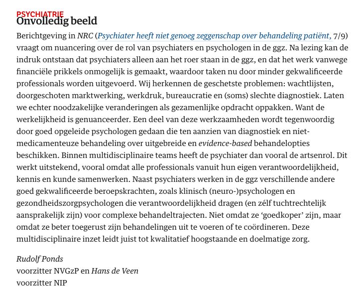 Het NIP en de Nederlandse Vereniging van gz-psychologen en haar specialismen (NVGzP) willen graag een nuancering aanbrengen op de berichtgeving in de NRC van 7 en 8 september over de rol van psychiaters in de ggz. De indruk zou kunnen ontstaan dat de psychiater anno 2020 alleen aan het roer staat in de ggz, maar dat dat vanwege financiële prikkels onmogelijk is gemaakt. Zo kan men het beeld krijgen dat hierdoor veel taken worden uitgevoerd door minder gekwalificeerde professionals.
