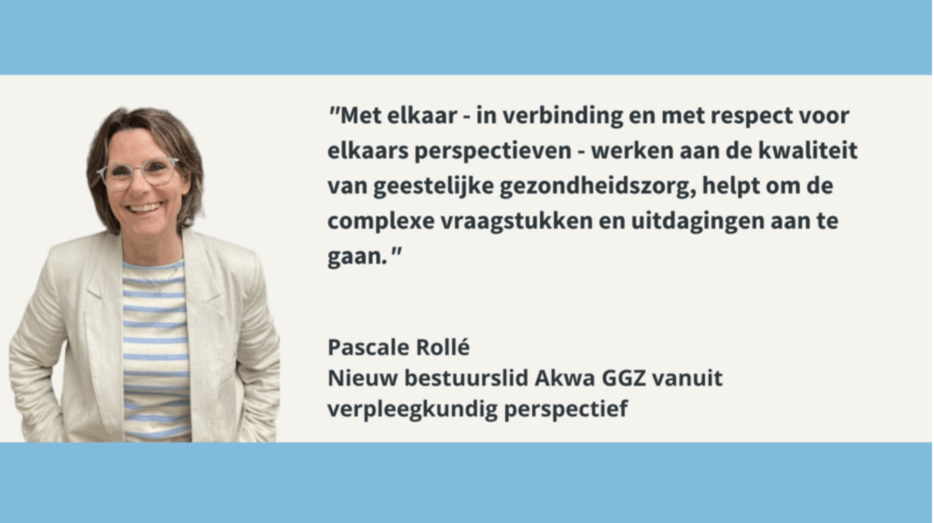 23 april 2025 – Op 15 april is tijdens de vergadering van de raad van toezicht (RvT) van Akwa GGZ, Pascale Rollé benoemd als nieuw bestuurslid. Zij vervangt Berno van Meijel, één van de bestuursleden van het eerste uur, die per 1 juli 2025 zal aftreden. Beiden hebben een sterke verbinding met het verpleegkundig perspectief op de ggz.