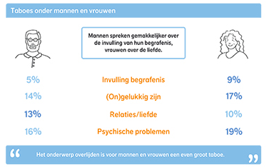 Een ander taboe is de dood en de consequenties hiervan voor de partner die achterblijft. Uit het onderzoek blijkt dat de dood van de partner bij ruim driekwart (76%) invloed op de financiële situatie zal hebben. Toch spaart 48% niet om een periode van inkomensverlies te overbruggen. Ook geeft 42% aan dat er te weinig verzekeringen zijn afgesloten om inkomensverlies op te vangen. Ondanks de financiële risico’s bij het overlijden van de partner, geeft 35% aan dat zijzelf en de (eventuele) partner geen overlijdensrisicoverzekering hebben.
