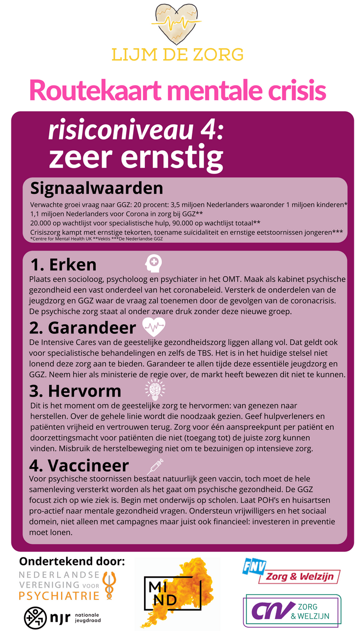 De voorspelling is dat door de coronacrisis de vraag naar geestelijke gezondheidszorg met 20 procent zal stijgen (Centre for Mental Health UK): dat zijn 3,5 miljoen Nederlanders waaronder 1 miljoen kinderen. Vóór corona was de GGZ in Nederland al in crisis, met 1,1 miljoen Nederlanders in zorg, 20.000 op wachtlijst voor specialistische hulp en 90.000 op wachtlijst totaal (Vektis).