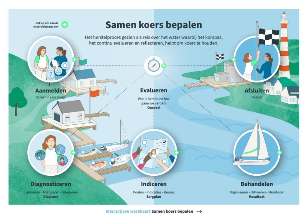Henk geeft aan dat de zorgstandaard Diagnostiek ruimte geeft aan de cliënt om naar eigen vermogen zelf de regie te pakken, terwijl de professional ondersteunt om je weg te vinden in alle uitdagingen. “Zie jezelf als een bootje op zee. Samen met je behandelaar en je naasten heb je een doel gesteld, de koers bepaald. Afhankelijk van de externe factoren zoals weersomstandigheden en je eigen stuurkunsten, je vermogen, probeer je de bestemming te bereiken. Door te evalueren kan je jouw route en bestemming bijstellen. Veel factoren spelen een rol bij het bepalen van de behandeling en jouw route, die zie je pas als je terugkijkt en reflecteert. In de nieuwe werkkaart van de zorgstandaard Diagnostiek staan veel handvatten om hier mee aan de slag te gaan.”