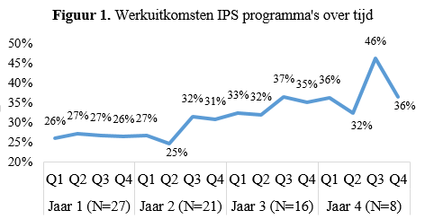 Uit de analyses over de afgelopen jaren kwam naar voren dat zowel de werkuitkomsten (zie figuur 1) als de modeltrouwcijfers significant zijn verbeterd  in de afgelopen jaren (een gemiddelde score van 91 tijdens de eerste meting ten opzichte van 108 tijdens de laatste meting). Deze resultaten laten zien dat programma’s die over een langere tijdsperiode IPS implementeren, hoger scoren op modeltrouw én meer cliënten aan een betaalde baan helpen.