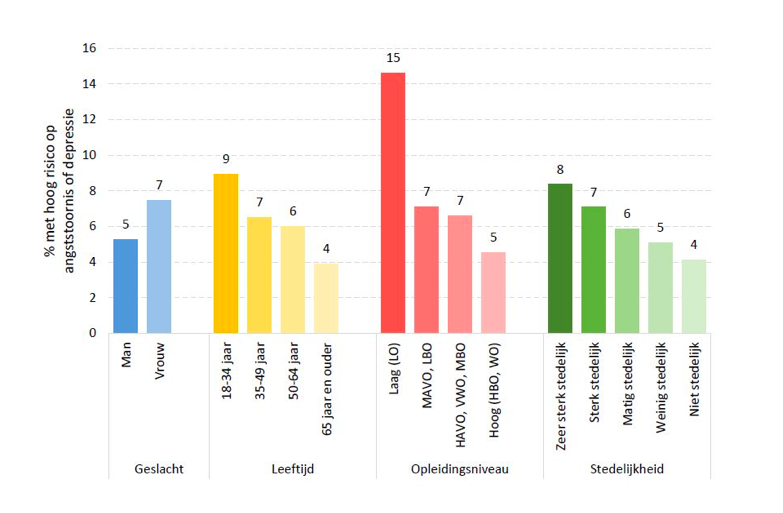Naast de jongvolwassenen, komt een hoog risico onder andere vaker voor bij vrouwen, inwoners met een laag opleidingsniveau en in GGD Gemeentelijke Gezondheidsdienst -regio’s met een hoge stedelijkheidsgraad.