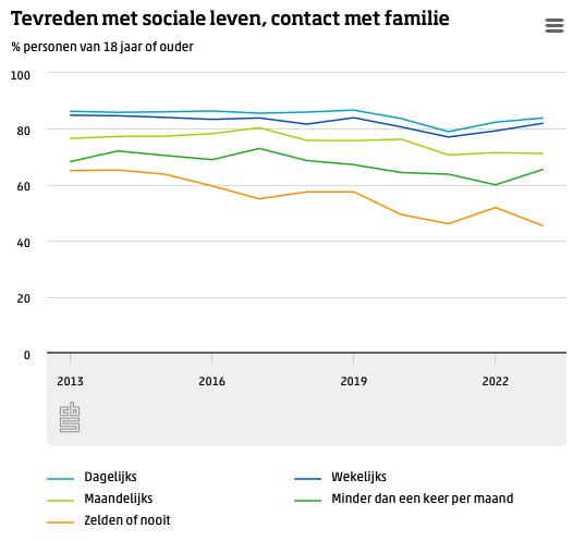 In 2013 was 85 procent van de mensen die dagelijks contact hadden met familie tevreden met hun sociale leven, tegen 65 procent van hen die zelden of nooit contact hadden met hun familie. In 2023 is dit verschil groter geworden: 84 tegen 45 procent.