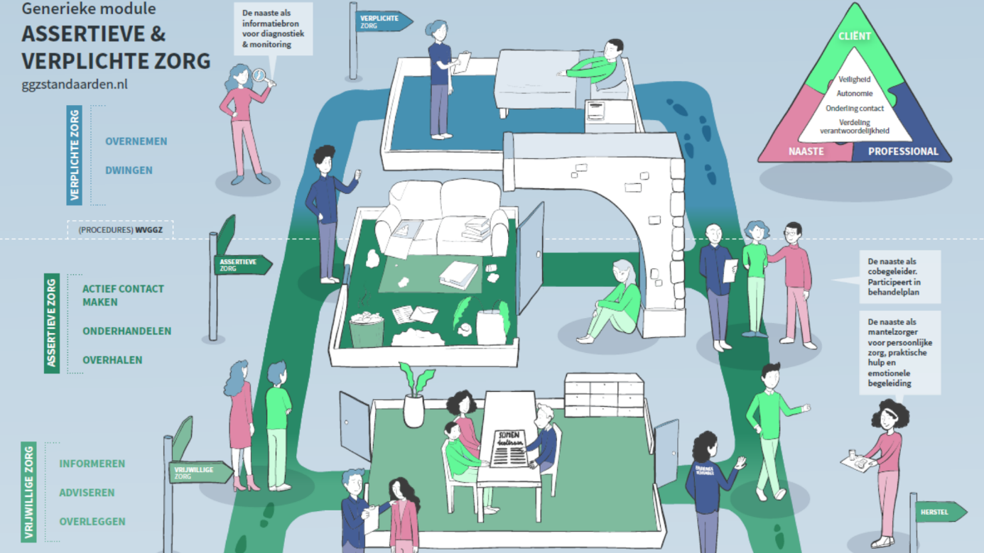 Met assertieve zorg wordt getracht verplichte zorg te voorkomen, want dat heeft de voorkeur boven verplichte zorg. Patiënten ontvangen deze zorg alleen als er sprake is van een psychische aandoening die leidt tot, of risico geeft op ernstig nadeel voor de patiënt of de omgeving. Er zijn aanpassingen gedaan vanwege de invoering van de Wet verplichte ggz (Wvggz), er is meer aandacht voor het verschil tussen patiënt- en naasteperspectief en de module is meer gericht op het voorkómen van verplichte zorg. Het grootste deel van de module is volledig herschreven. Ook de naam van de module is gewijzigd van Dwang en drang naar Assertieve en verplichte zorg, dit sluit beter aan bij de Wvggz. De module sluit aan bij landelijke initiatieven rondom assertieve en verplichte zorg.