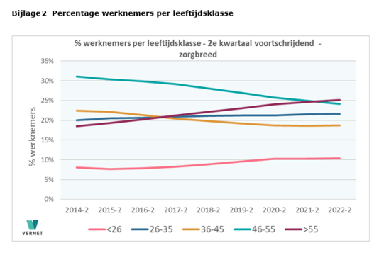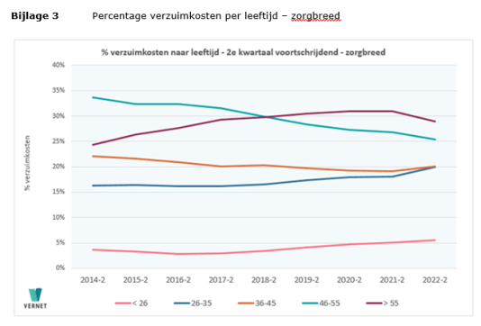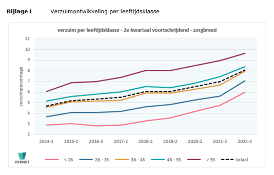 Vernet wijst erop dat ook de oplopende verzuimkosten een aandachtspunt zijn. Hierin is nu een opvallende ontwikkeling te zien. Hoewel de groep werkende ouderen in de sector steeds groter wordt en zij in absolute zin het hoogste verzuimpercentage kent, neemt haar aandeel in de totale verzuimkosten af. Het aandeel van de jongeren in de verzuimkosten groeit daarentegen. Zie bijlage 2 en 3.