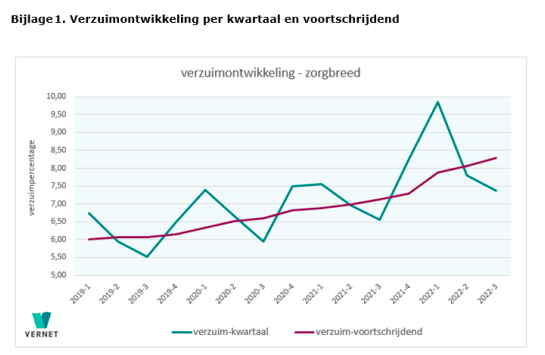 Het ziekteverzuim in de zorgsector is in een jaar tijd sterk gestegen. Dit blijkt uit nieuwe cijfers van Vernet. Waar het verzuimpercentage over het derde kwartaal uitkwam op 7,37 is, was dat in dezelfde periode een jaar geleden nog 6,55, een stijging van 13 procent.