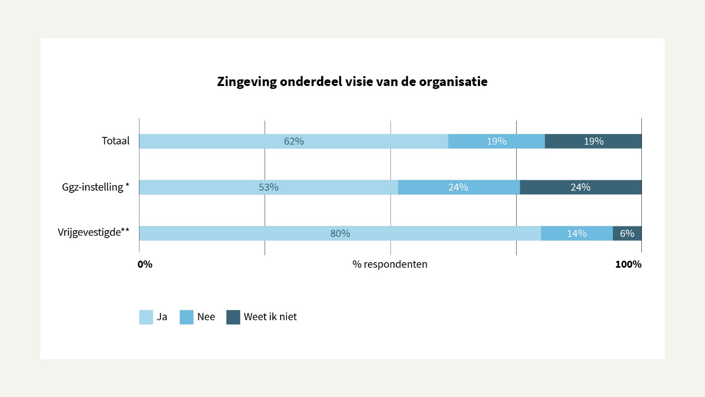 Volgens de respondenten is bij ruim 50% van de ggz-instellingen zingeving onderdeel van de visie, bij vrijgevestigden is dit 80%.  Van de ggz-instellingen maakt 70% gebruik van de inbreng van een geestelijk verzorger, voor vrijgevestigden is dit 29%. Bij ggz-instellingen is zingeving vaker als een thema bij enkele collega’s ondergebracht, bij vrijgevestigden wordt het vaker door de behandelaar zelf toegepast.
