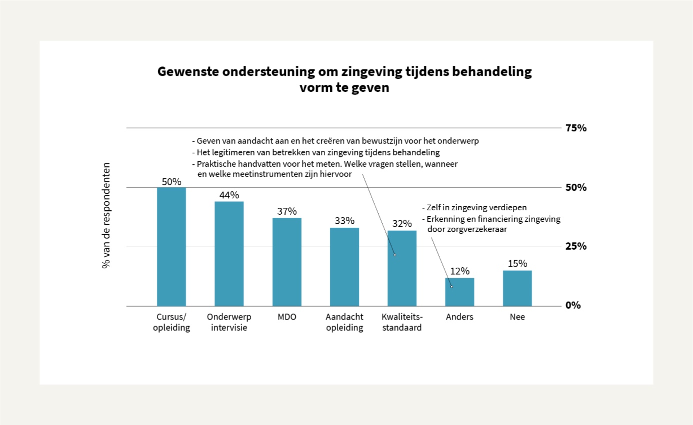 Een ruime meerderheid van de respondenten vindt dat zij voldoende kennis, vaardigheden en tijd hebben om zingevingsvraagstukken of spirituele kwesties met de patiënt te bespreken en de helft vindt dat het ook past binnen de cultuur van de organisatie om aandacht te geven aan zingeving en/of spiritualiteit. Van de respondenten heeft 85% behoefte aan een vorm van ondersteuning om zingeving tijdens de behandeling vorm te geven. Als vormen van ondersteuning worden onder andere een cursus of opleiding, bespreken als onderwerp bij intervisie en bespreken in het MDO genoemd.