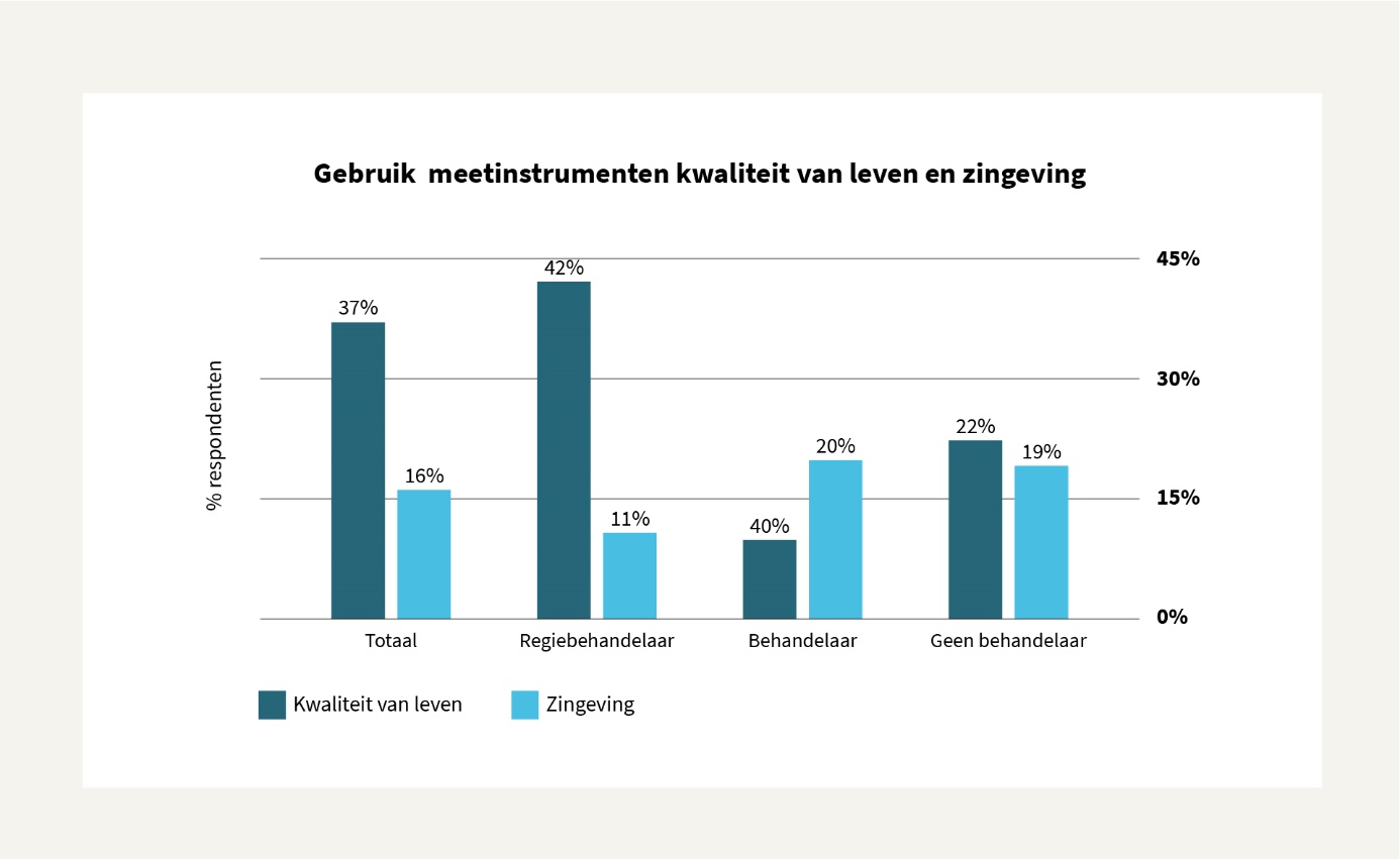 Van de respondenten geeft 65% aan dat zingeving onderdeel is van de behandeling, 45% dat het onderdeel is van de (evaluatie van) behandeldoelen en 43% noemt het als onderdeel van de anamnese/diagnostiek. Van de panelleden gebruikt 37% een meetinstrument om de kwaliteit van leven in kaart te brengen; slechts 16% gebruikt een instrument om zingeving te meten.