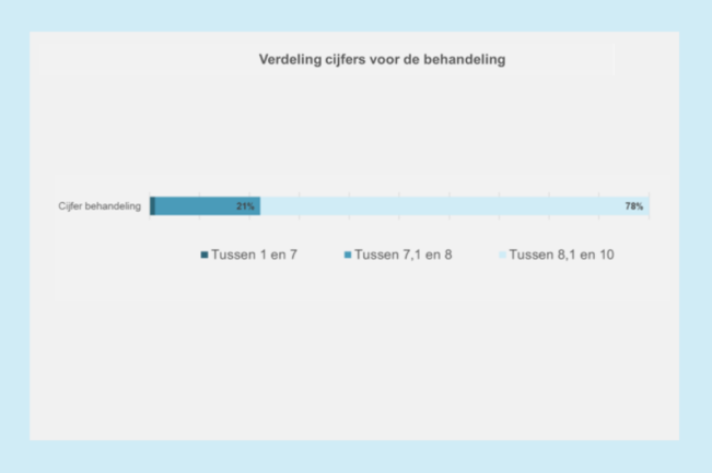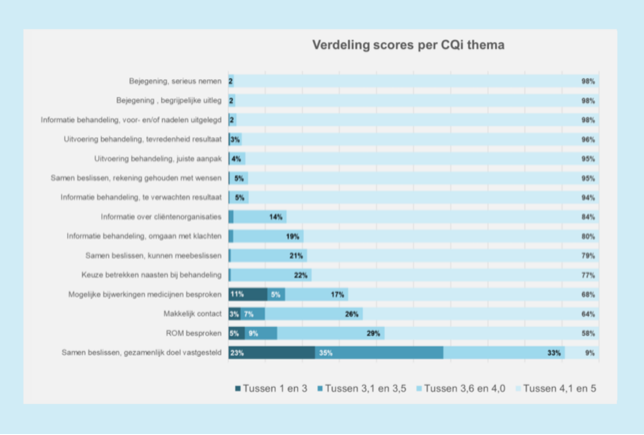 De grafiek verderop geeft voor alle CQi-thema’s weer welk deel van de patiënten het thema een cijfer tussen de 1.0 en 3.0, tussen de 3.1 en 3.5, tussen de 3.6 en 4.0 of tussen de 4.1 en 5.0 geeft. Het cijfer voor de behandeling wordt op een schaal van 1 tot 10 weergegeven. Percentages tellen voor sommige thema’s op tot 99% of 101% door afronding.